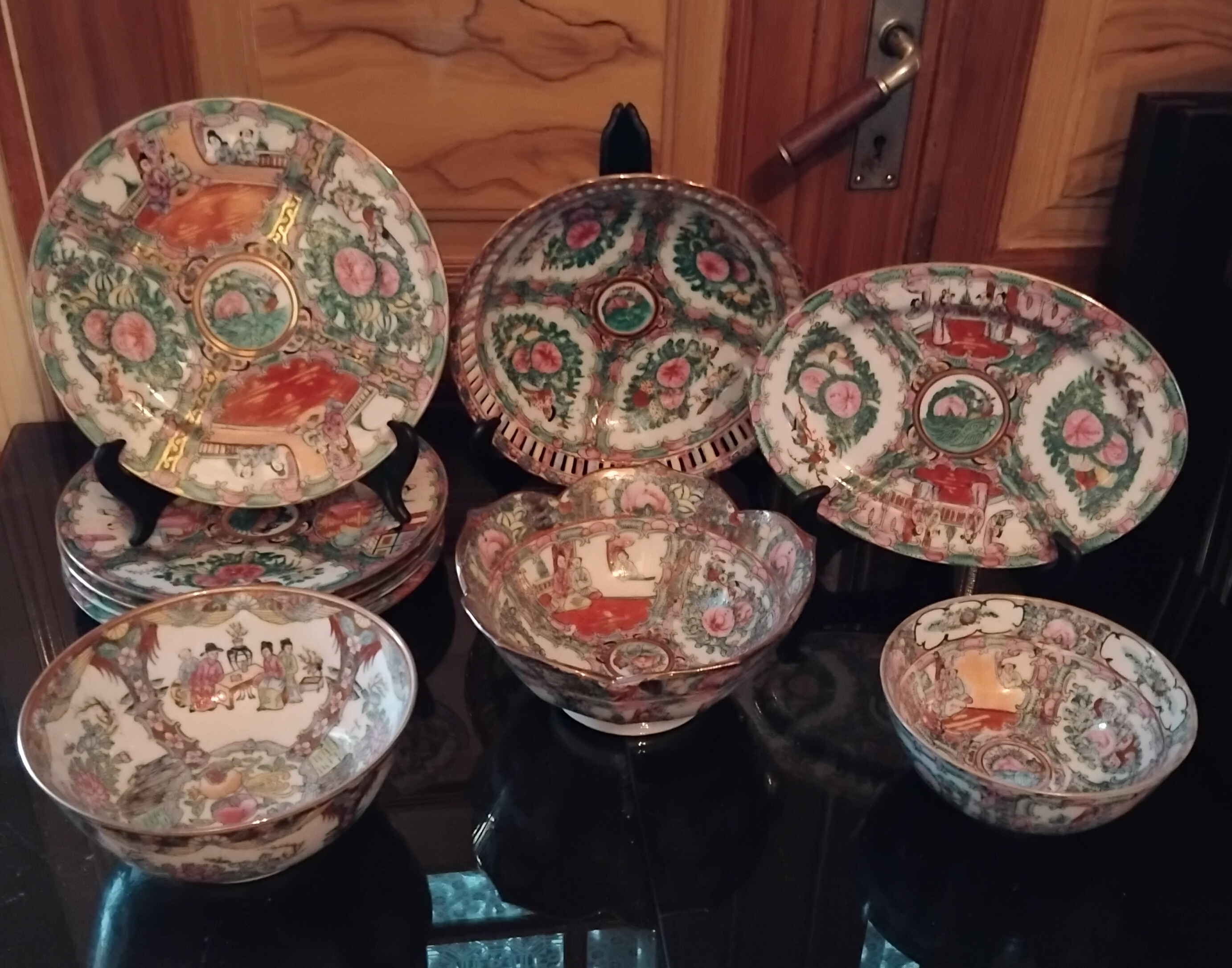 The image displays a set of Chinese Famille Rose Medallion porcelain dishes, a highly collectible style of Chinese export porcelain that developed around 1820 for Western markets.